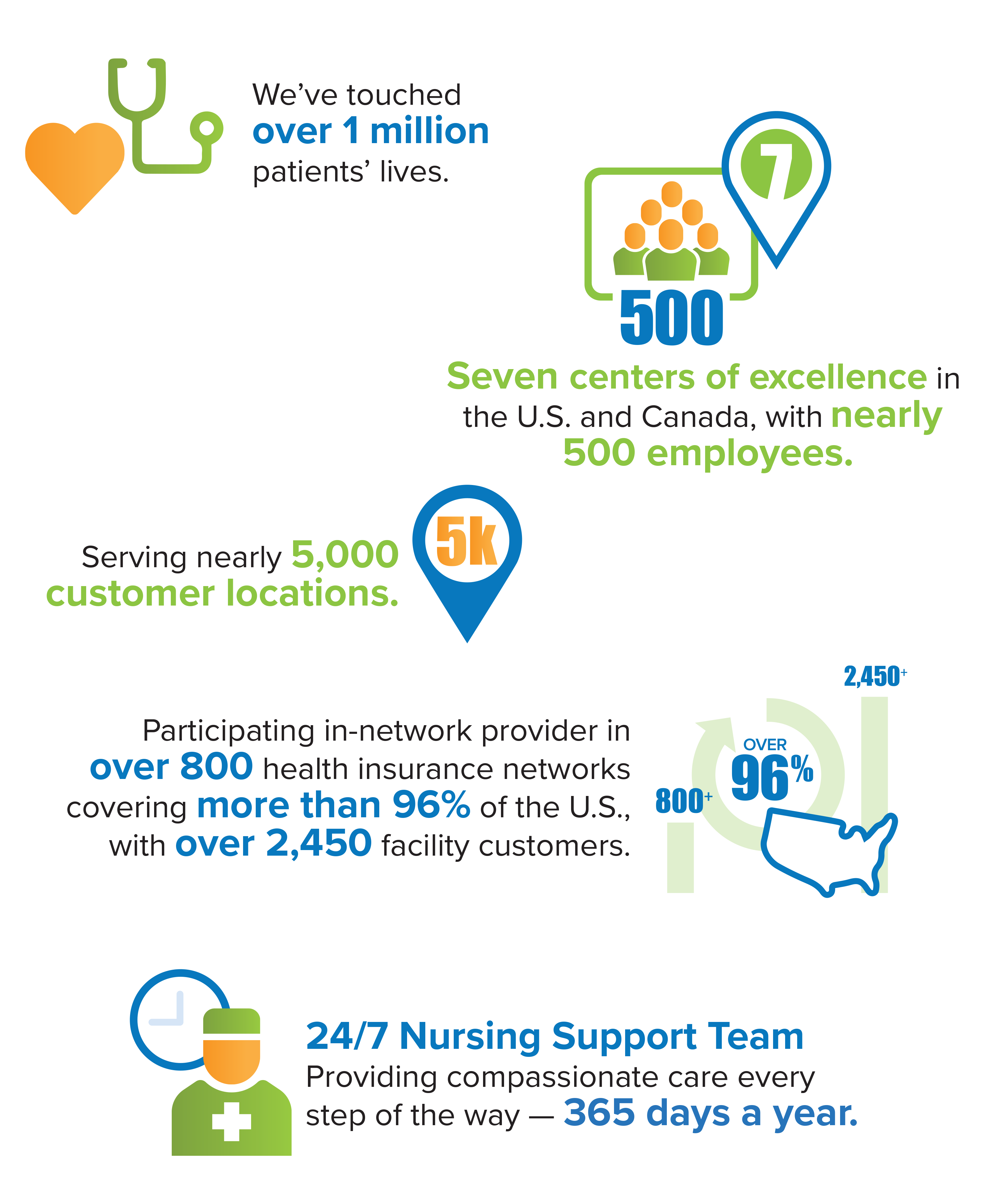 Our guiding principle is patients first. We are dedicated to doing the right thing for the patients whose lives we touch, for our customers and for our employees. More than 500 dedicated employees – including registered nurses (RNs), customer care coordinators, insurance specialists and expert biomedical technicians – demonstrate compassion and innovation in their daily work.