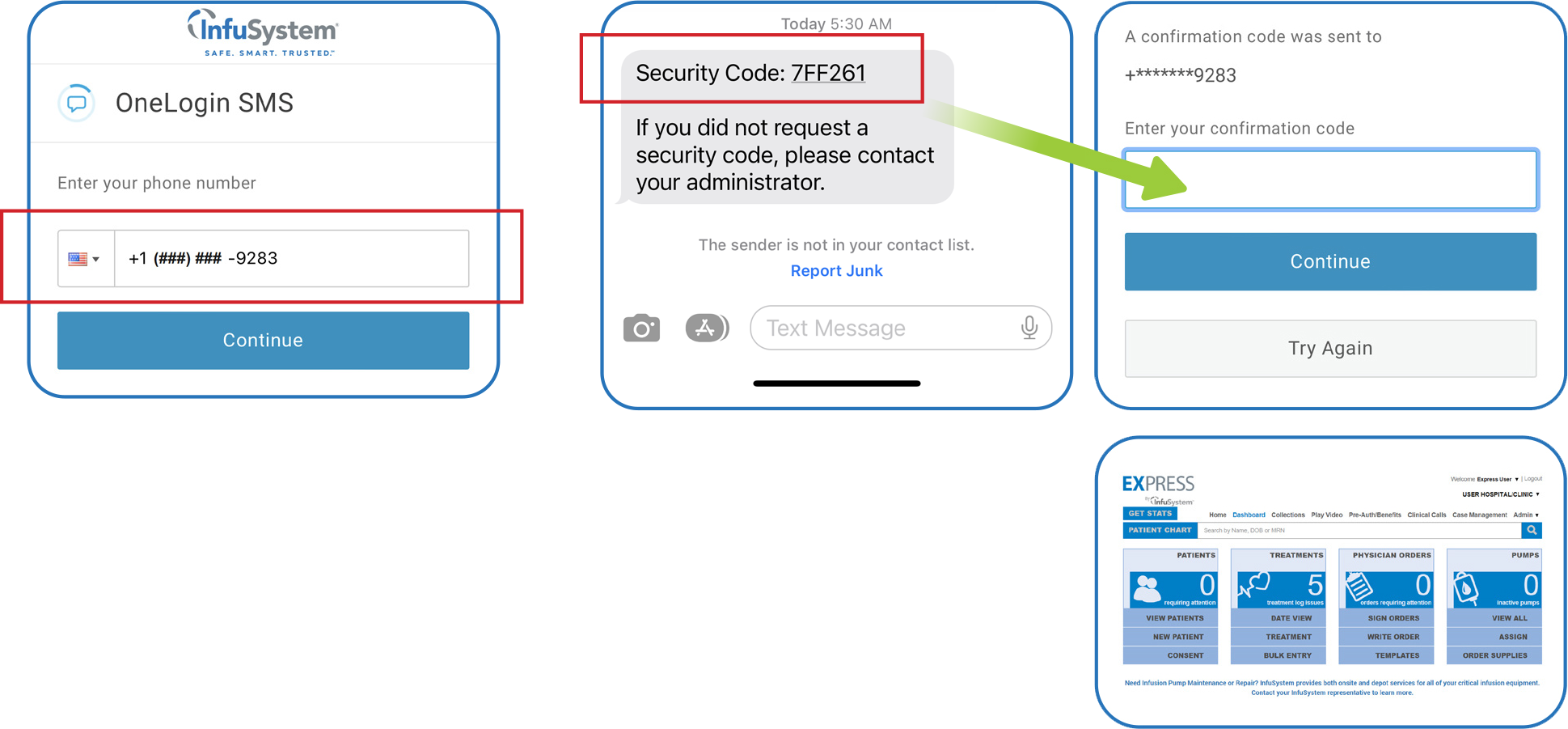 A code to authenticate will be texted to the phone number you provided. Enter the confirmation code you received from OneLogin and click "Continue" to navigate to the EXPRESS Dashboard.
